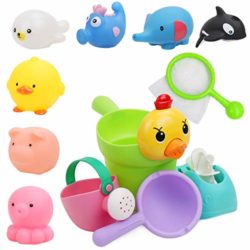 Jelly dog Toy 12 Pcs Toddler Bath Toys,Soft Cute Animals Bath Squirters , Fishing Net, Kettle, Pinwheel, Spoon,Scoop, Beach Bathroom Dual Use Water Toy for Baby Product Features Includes:7 Soft Cute