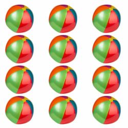 Includes set of twenty- four 12 inch multi colored beach balls. The perfect toy for summertime, Beach and pool outings, concerts, and more. Easily inflates and deflates for Easy