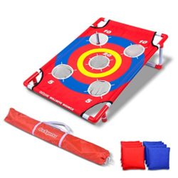 Join the fun with GoSports newest bean bag toss game Bullseye Bounce! The game comes with 1 3’x2′ foldable score target, 8 sturdy bean bags, a portable travel carrying